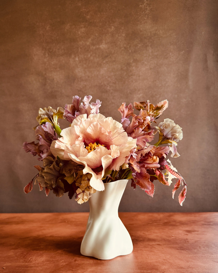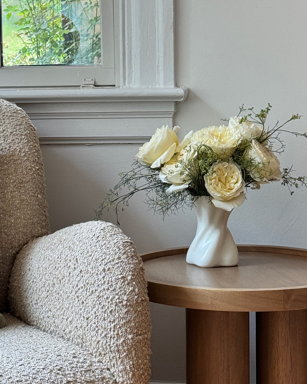 Baby Twist is a sculptural study in scale—an intimate echo of its taller counterpart, Twist No.1. With its soft flare and cinched waist, this smaller form invites just a few stems to move with ease and purpose. It brings quiet presence to any arrangement, allowing flowers to arc, spill, and settle in their own rhythm.